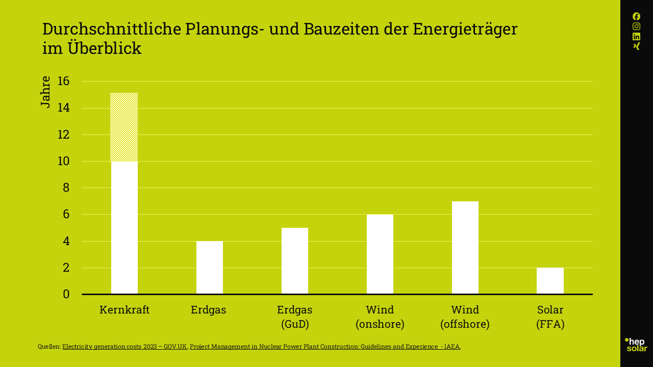 Grundsätzlich gilt: Je komplexer die zugrunde liegende Technologie, desto länger dauern Entwicklung, Bau und Inbetriebnahme. Aber um die Unterschiede besser einordnen zu können, lohnt sich ein Blick auf die Funktionsweise, den Nutzen und die zukünftige Rolle der einzelnen Energieträger.
